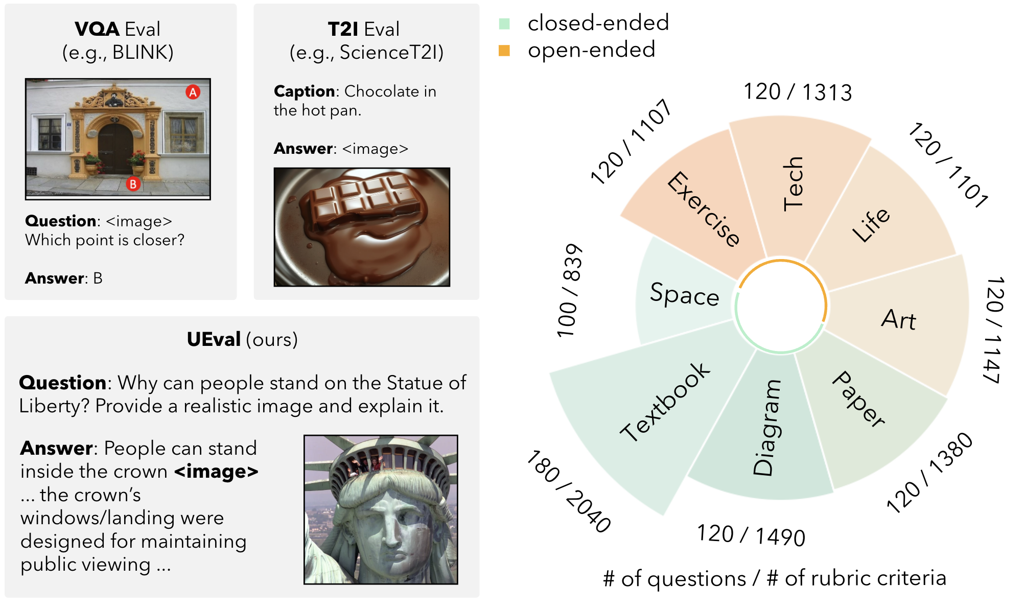 UEval comprises 1,000 expert-curated prompts that require both images and text in the model outputs, sourced from 8 diverse real-world domains.